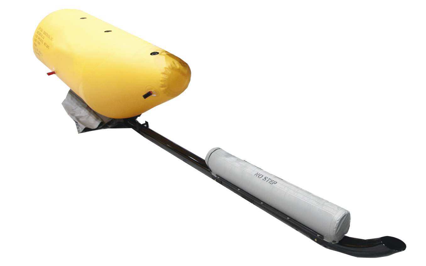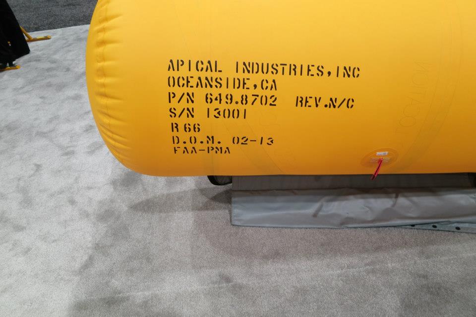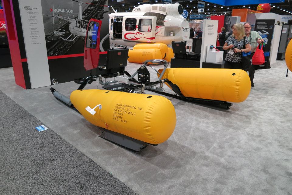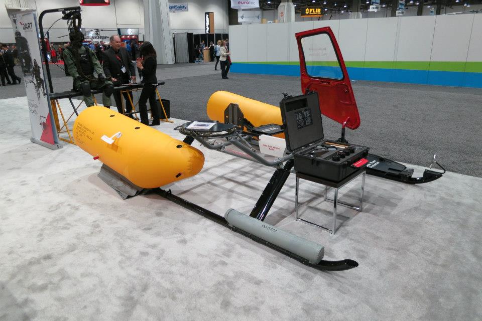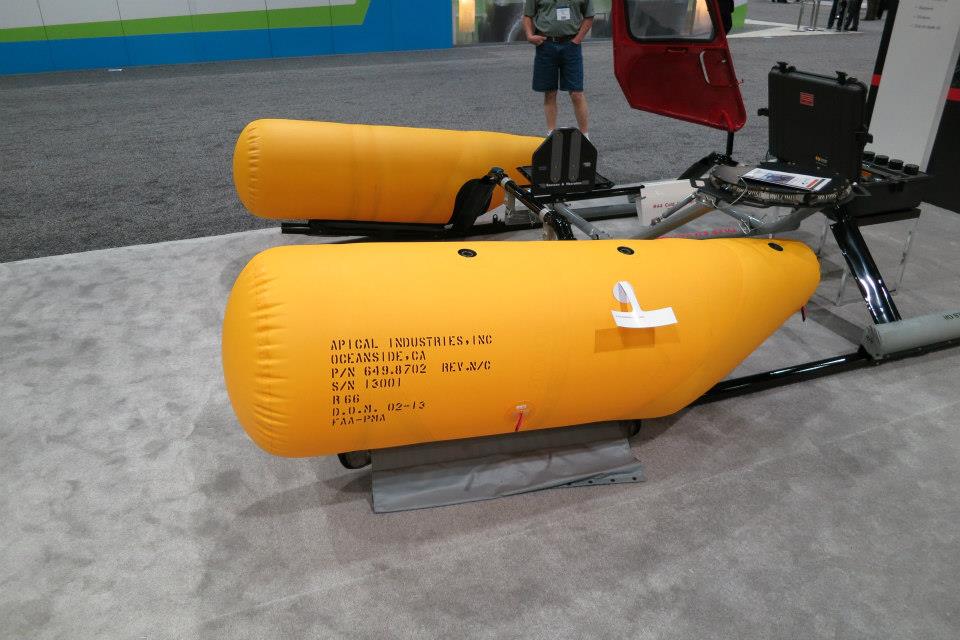 Dart Aerospace R66 emergency float unveiled at 2013 HeliExpo in Las Vegas. Shown here with rear compartments inflated and front compartments stowed in cylinder.