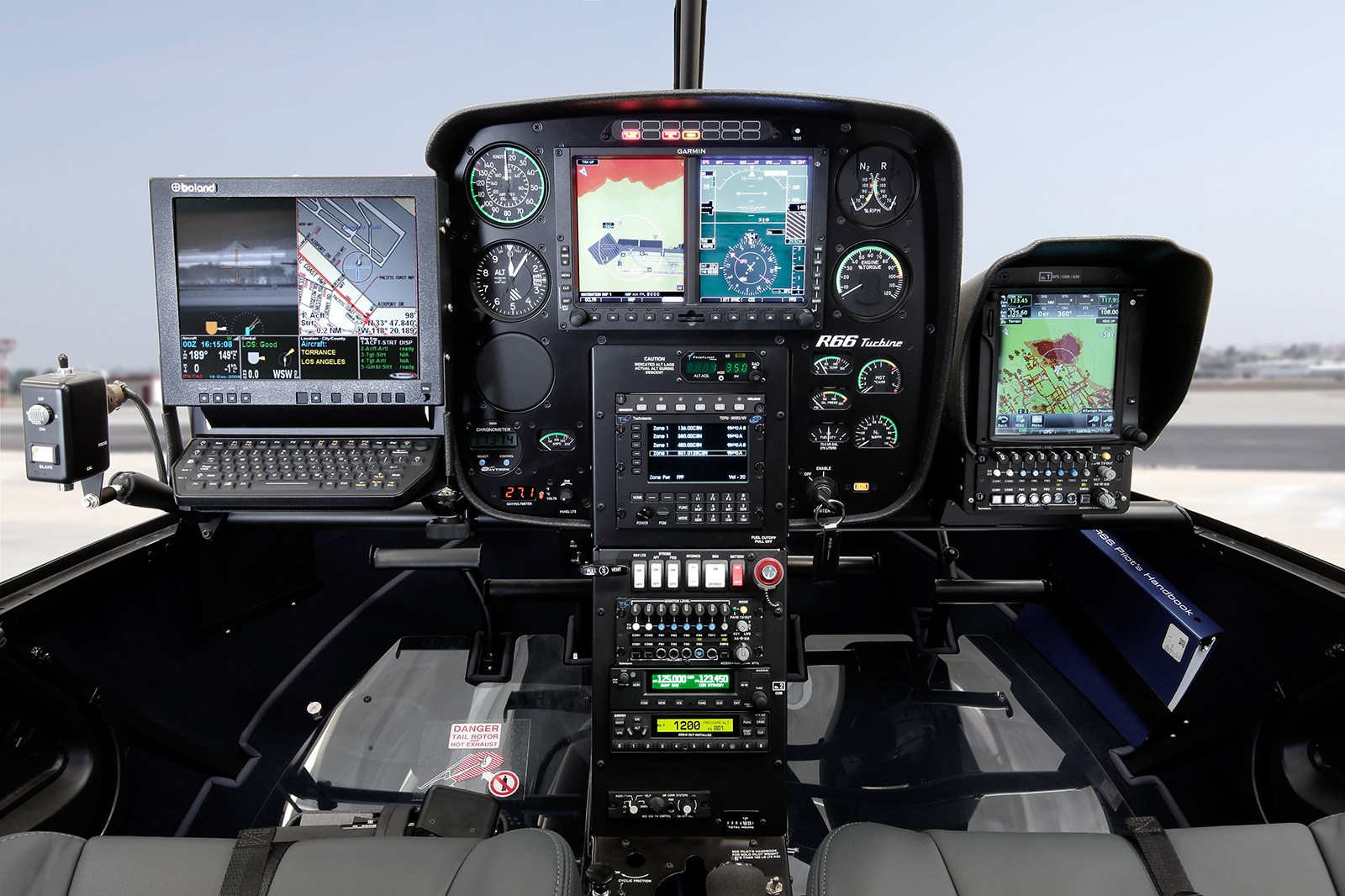 Torrance, CA — Robinson Helicopter Company announced its R66 Turbine Police Helicopter with the FLIR Systems Ultra 8000 Infrared Camera and the Spectrolab SX-7 searchlight with 30-million candlepower has been reconfigured to include a multitude of upgrades. This high performance 4-place police helicopter comes standard with a Garmin G500H Primary and Multifunction Display System (PFD/MFD), a Garmin GTN 635 touch-screen navigator, and a Garmin GTR 225A COM radio. Also standard are Boland’s 10.4” LCD monitor and two 6-channel audio controllers.
